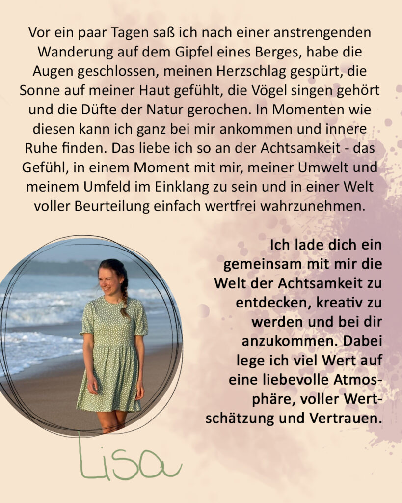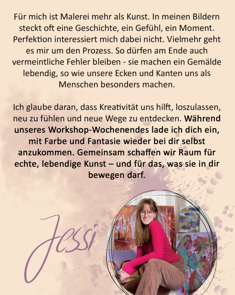 – kreative Workshops (u.a. angeleitete intuitive Malerei, Mixed Media,…) inkl. Material & Erinnerungsstücken für Daheim
