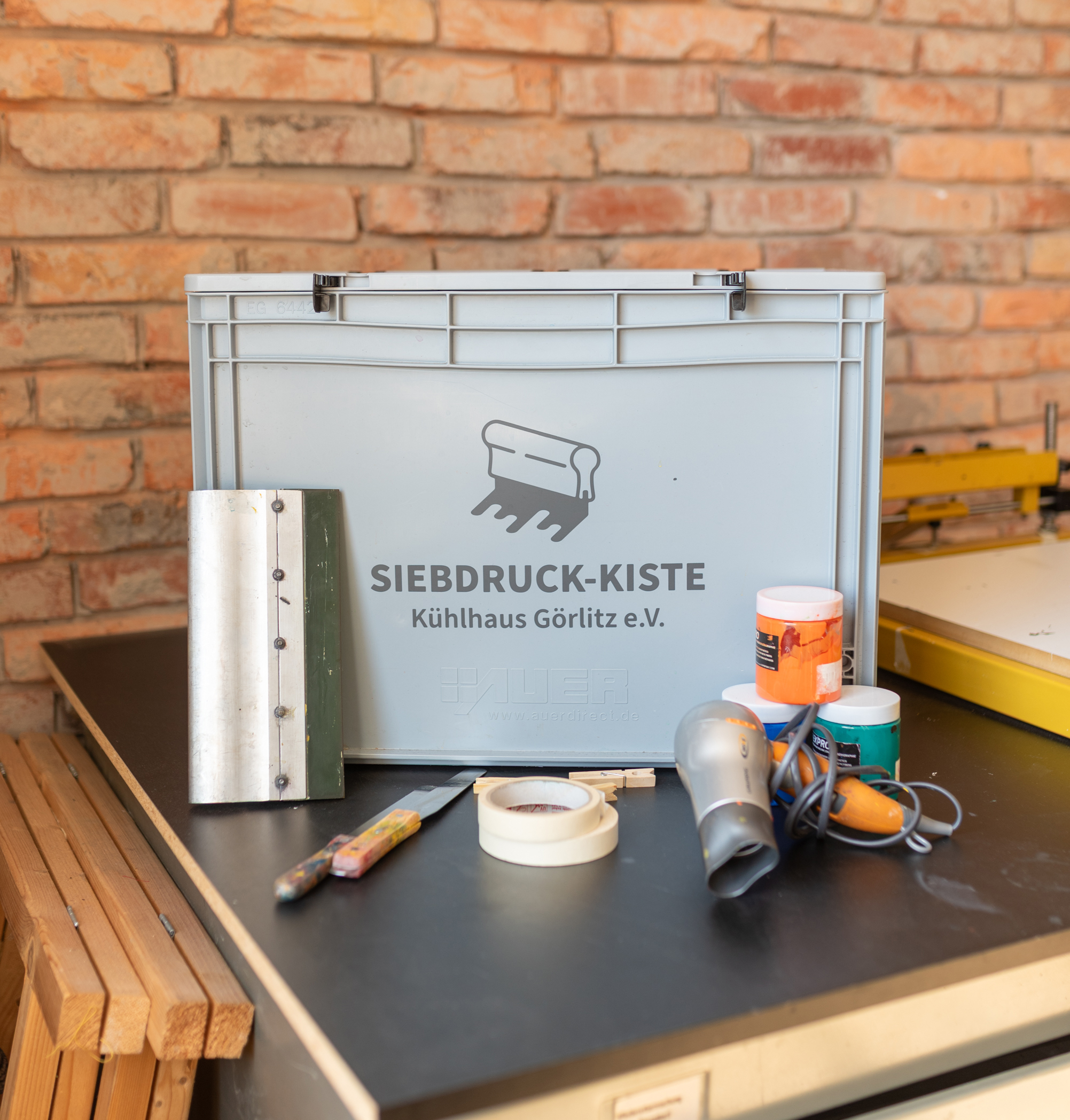 Ihr könnt auch gern unsere Siebdruckkiste, mit allen nötigen Materialien (Rakel, Spachtel, Klebeband, Wasserwanne etc.) für eine eigene Siebdrucksession bei Euch daheim, im Verein oder auf eurem Familienfest ausleihen. Die Leihgebühr beträgt 5 € pro Tag. Vorgefertigte Siebe mit Motiven können zusätzlich ausgeliehen werden.